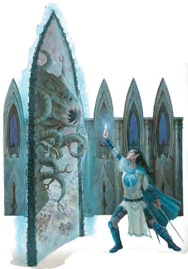 Die rechte Hälfte dieser Halle von einem mächtigen, hohen hölzernen Buchregal gefüllt, welches mit einigen Seitenärmen erweitert wurde. Die linke Hälfte der Halle ist voller Schreibtische mit arkanen oder alchemischen Aufbauten, einer Sofaecke, einem Kessel über offenem Feuer und abgeschirmter arkaner Ingredientien, umgeben von experimentellen Aufbauten. Dominiert wird dieser Teil des großen Raumes jedoch von einem gut vier Schritt breiten, kreisrunden Riss in der Wirklichkeit, zentriert auf einem Beschwörungskreis in der Mitte des Laboratoriums. Die Gefährten blicken in ein beinahe heilloses Chaos an umhereilenden Zirkelmitgliedern, einigen Gauths und arkanen Wachen. Mittelpunkt des Geschehens ist der flackernde Riss in der Wirklichkeit, zweifelsohne das fragliche Portal. Die Luft wabert von der Kraft des Portals und der Blick wird dann und wann von diesem Tor in eine andere Dimension zu schrecklichen Anblicken entführt. Der zuvor gesehene Wächter des Ceruleanischen Siegels stemmt sich scheinbar, unterstützt von zwei Akolyten gegen das Portal, einen brillianten Kristall in der Hand. Einige arkanen Wachen schleppen die Leiche eines ausgewachsenen Betrachters von dem Portal weg. Xavier von Weißenfels persönlich steht, umringt von einigen Assistenten und Betrachterlingen an einem Schreibtisch, heftig diskutierend und diverse obskure Werkzeuge wie beispielsweise einen Ebenenkompass einsetzend. Zwei Lehlinge hieven gerade eine Steinstatue eines Gnoms aus dem Weg und zu den Buchregalen, wo derzeit fast kein Betrieb ist. Sie bereiten damit mehr Platz für drei Gildenmagier, welche einige Schritt vor dem Portal in Stellung sind, geschützt hinter umgekippten Tischen und einer masssiven, jedoch improvisiert wirkenden Steinmauer. Schreie, Kommandos, Warnungen, Fragen und Antworten schallen durch das Durcheinander in das die Gefährten geraten sind. Ein Akolyt der gerade ein dickes Buch aus dem massiven Regal geholt hat, welches mit dem Schriftzug "ziqq-�ayp" in massiven Runen beschildert ist, eilt an dem Flur vorbei, in dem die Gefährten gelandet sind, und blickt zu ihnen. "Ah, sehr gut Verstärkung, geht doch gleich,... Moment! Wer seid Ihr? Was ist mit Slerubvlob?" Er lässt das Buch fallen und eine feurige Kraft sammelt sich in seiner Hand. Seine angespannte Miene verfinstert sich. Er starrt die verblüfften Gefährten an. |